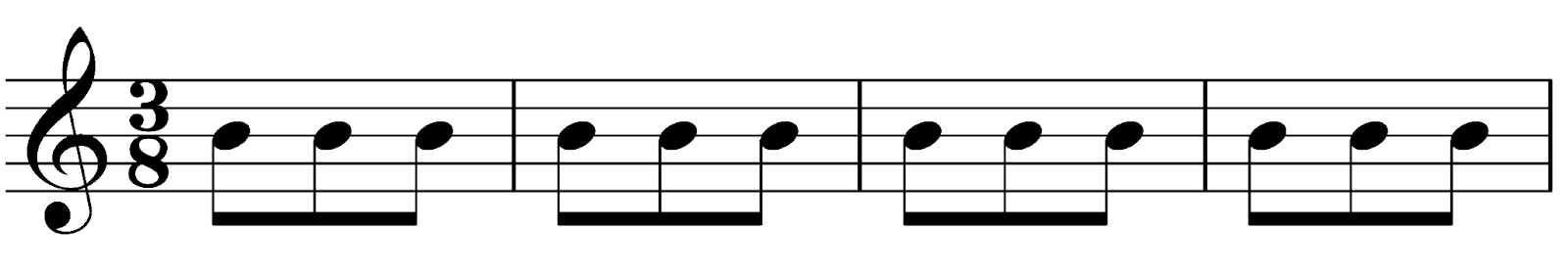 他の例も見てみましょう。拍が八分音符でできていて、それが3つでグループ化しているときは、3/8拍子(八分の三拍子)となります。