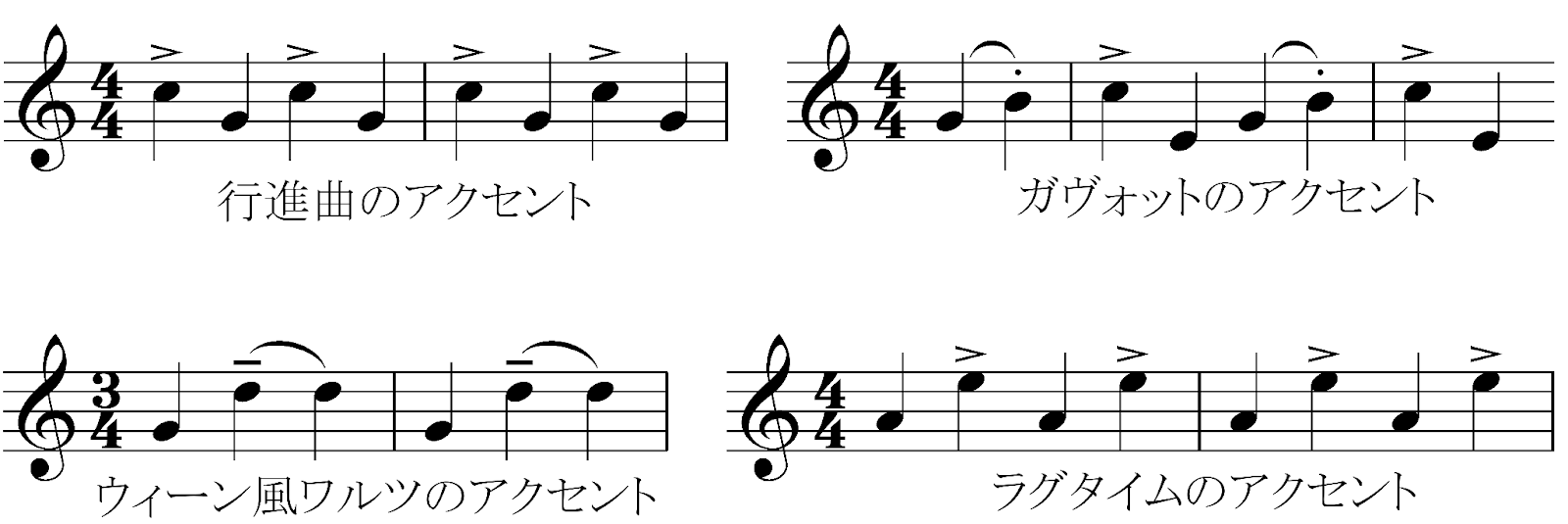 前項の説明のなかで、強拍は強く演奏するという意味ではないという話をしました。しかし、拍子の中の拍は決して均等とは限りません。ある拍を強調して演奏する場合、その音をアクセントといいます。ただしこれも誤解の多い言葉で、「>」の記号で表すアクセントとは違う意味です。どちらかというと、言葉のアクセントや、「訛り」という意味のアクセントに近いです。同じ拍子でもアクセントが違えば全く違うリズム感が生まれます。