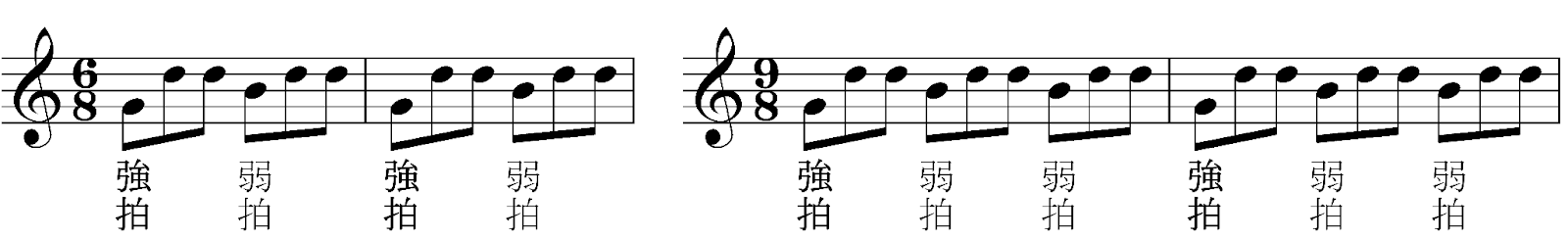 単純拍子の拍をそのまま3分割すると複合拍子になりますが、この強拍と弱拍は受け継ぎます。