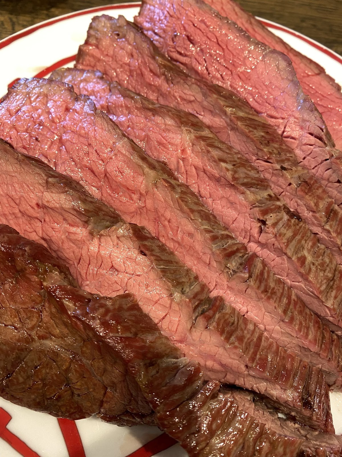 また、家でも赤身の塊肉を焼いて食べることもあります。これまた肉汁たっぷりで最高です!!