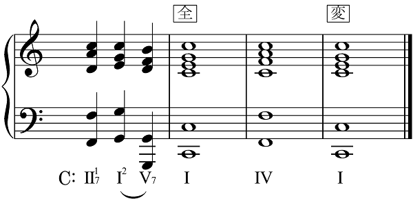 これも歴史のある終止で、IV→Iと進みます。全終止の後に変終止が用いられることが多く、大曲の終わりを支える長大な終結部が丸ごと変終止であるようなパターンもよく見かけます。全終止の後にIV→Iとなるだけの小さな変終止の場合、「アーメン終止」と呼ばれることもあります。また、この場合の全終止は II→V→IのIの代わりに、IV度調のVが使われることがあります。