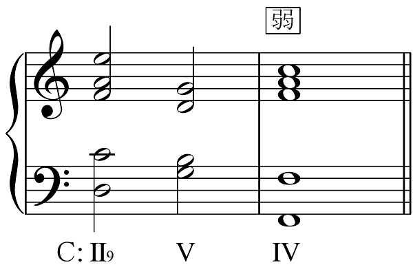 これも筆者の造語ですが、全終止のIをIVに置き換えたものを弱終止と呼ぶことにしましょう。V→IVの進行は弱進行と言って、本来避けるべきとされています。しかし実際にはよく見かけます。IVがIへの倚音のように使われているパターンもあれば、VからIVへの弱進行を強調したパターンもあります。またブルースでは基本的な進行だったり、ポップスには多用されていることから、これにも名称があるべきですので、弱終止と呼ぶことにしました。