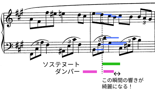 こんなときに、ちょうど良いタイミングでソステヌートペダルとダンパーペダルを踏むと、まるで左手だけにペダルがかかったかのような効果を生み出すことができます。