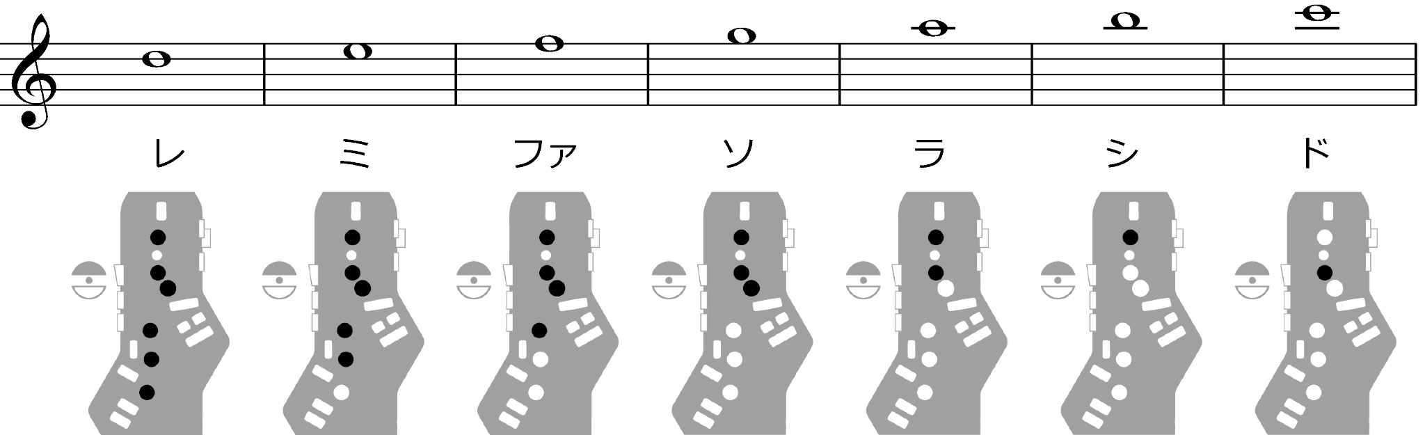 ここまで、ドからドまでの8つの音を練習してきましたが、左手親指のオクターヴキーを使うだけで、一気に音域を倍に広げることができます!レからドの音それぞれに、オクターヴキーを付け加えて吹いてみましょう。